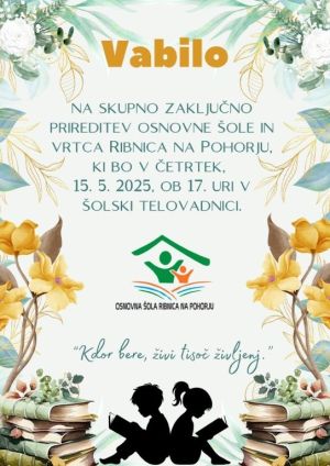 V četrtek,15. 5. 2025, smo vrtčevski otroci in učenci Osnovne šole Ribnica na Pohorju skupaj z mentorji priredili zaključno prireditev. Ta je bila posvečena branju, njeno sporočilo je bilo namreč »Kdor bere, živi tisoč življenj«, znamenita misel G. R. R. Martina. Prireditev se je odvijala v telovadnici naše šole. Učenci so z igro uprizorili razvoj pisave od njenih začetkov do danes. Nastopajoči so se predstavili tudi z deklamacijami, petjem in plesom. Ravnatelj je razglasil tudi dosežke naših učencev na državnem nivoju. Prireditev sta povezovali učenki 6. razreda Zoja in Ajda. Ob koncu so učenci...